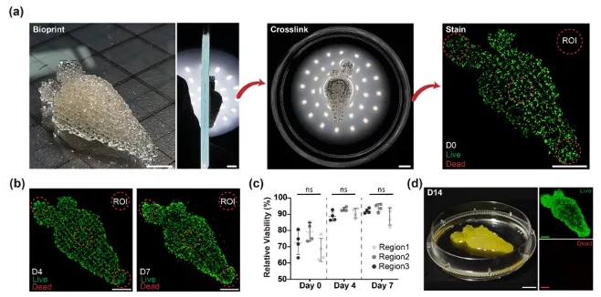 团队使用S-Cell墨水成功打印出厘米级的“胡萝卜形状”结构。活死染色结果显示,不同区域细胞活性一致,表明3D打印构建的多孔结构有助于营养物质的均匀交换(图7)。