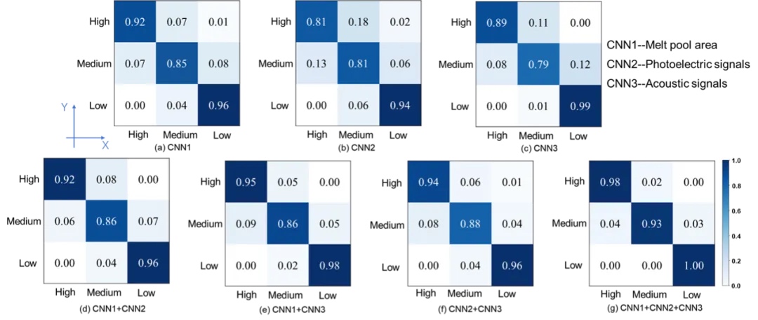 本研究通过改变激光功率和扫描速度实现对体积能量密度调控,进而获得不同质量的成形件。在实验样件打印过程中,利用高速相机、光电二极管与麦克风实时采集实验样品多个打印层的过程信号,并以质量表征结果为处理后的过程信号制作标签。通过训练卷积神经网络模型并分组融合,对比分析单传感、双传感以及三传感融合质量分类模型性能。