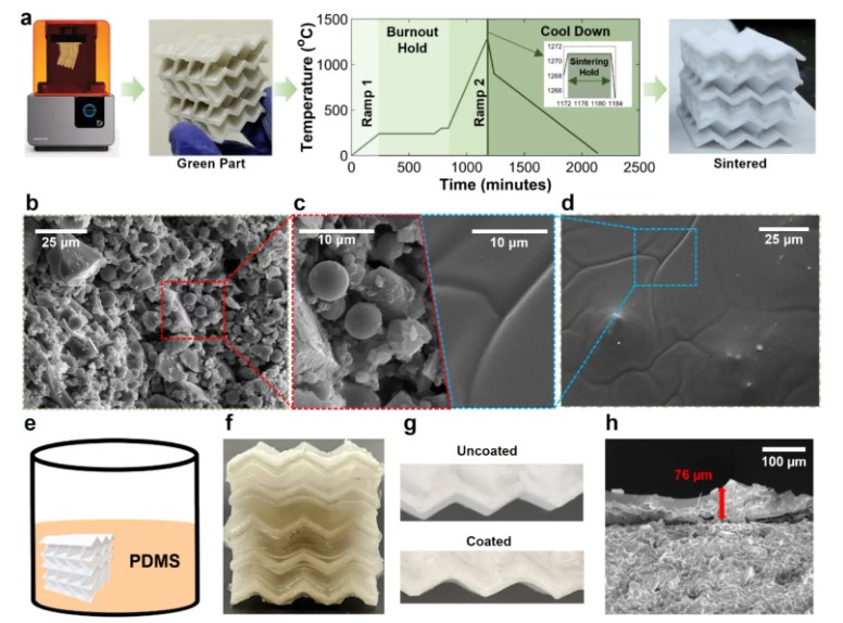 为了确保烧结收缩后的尺寸精度,研究团队在打印前调整了使用MATLAB和SolidWorks生成的数字设计文件。扫描电子显微镜 (SEM) 证实了成品陶瓷晶格内已成功致密化,且晶粒边界发育良好。