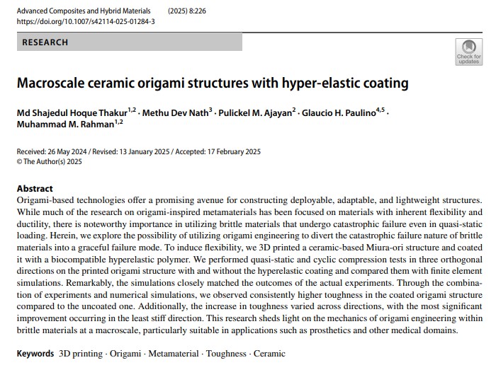2025年4月26日,来自休斯顿大学的研究团队开发了一种新方法,通过将受折纸启发的几何形状与生物相容性的弹性涂层相结合,制造出柔韧、抗损伤的陶瓷结构。该方法利用3D打印技术生产复杂的Miura-ori陶瓷结构,然后涂覆聚二甲基硅氧烷(PDMS),一种超弹性硅酮聚合物。最终得到的是一类脆性材料,能量吸收和故障容限性能显著提高。研究项目由机械与航空航天工程系助理教授Maksud Rahman领导,博士后研究员Md Shajedul Hoque Thakur做出了重要贡献。他们的研究成果以题为“Macroscaleceramic origami structures with hyper-elastic coating”的论文发表在《先进复合材料与混合材料》杂志上,全面介绍了陶瓷折纸结构的实验程序、材料建模和机械测试。