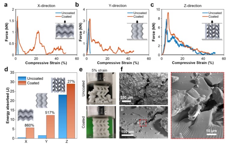 研究人员进一步评估了涂层陶瓷在X方向循环载荷下的破坏情况,压缩应变高达1.5%。未涂层结构在该阈值或以下失效,但PDMS涂层样品经受了多次载荷循环后,峰值力仅略有下降——这表明裂纹桥接和损伤得到控制。循环载荷模拟证实了这一趋势,并为损伤随时间演变提供了更多见解。