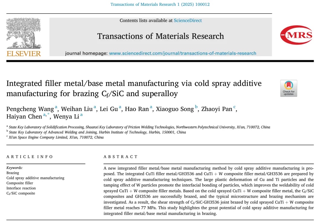 西北工业大学Pengcheng Wang,陈海燕Haiyan Chen等,在Transactions of Materials Research上发文,通过冷喷涂增材制造,实现了钎料/母材一体化制造,用于钎焊Cf/SiC和高温合金。还提出了一种冷喷涂增材制造钎料/母材一体化制造新方法。利用冷喷涂增材制造技术制备了整体CuTi钎料/GH3536和CuTi+W复合钎料/GH3536。Cu、Ti颗粒的大塑性变形和W颗粒的捣固作用,促进了颗粒间的界面结合,改善了冷喷涂CuTi+W复合钎料的焊接性。基于冷喷涂CuTi+W复合钎料,成功实现了Cf/SiC复合材料与GH3536的钎焊,并对钎焊接头的微观组织和钎焊机理进行了研究。