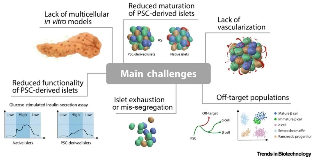 胰岛细胞来源是研究关键。原代人胰岛获取困难且有诸多弊端,永生细胞系和猪胰岛也存在不足。PSCs 虽能提供充足胰岛来源,但分化的细胞成熟度欠佳。胰岛周围细胞微环境对胰岛功能影响重大,生物打印多细胞结构可模拟体内环境,患者特异性支持细胞能降低移植排斥风险。