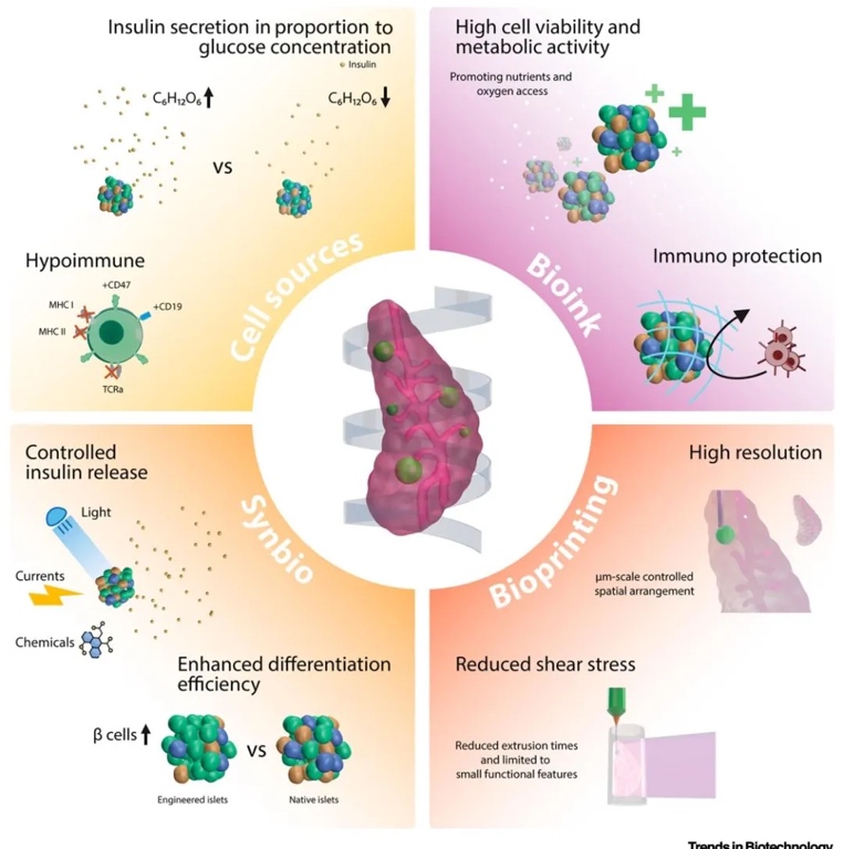 糖尿病是一种全球范围内影响超 5 亿人的复杂疾病,传统胰岛素治疗无法治愈,胰岛移植受供体短缺、免疫排斥等限制。同时,当前糖尿病治疗面临体外和体内模型预测能力差等问题。来自荷兰乌得勒支大学医学中心的 Riccardo Levato 教授团队在《Trends in Biotechnology》上发表Bioprinting and synthetic biology approaches to engineer functional endocrine pancreatic constructs” 为题的综述。文章总结了生物打印功能性内分泌胰腺的研究领域进展,涵盖细胞来源、生物材料、打印技术等方面,探讨了当前生物打印技术与合成生物学在该领域的进展,提出了通过生物打印与合成生物学的融合,有望开发出先进体外模型和可移植的功能性胰腺组织,为糖尿病治疗带来新希望的观点。