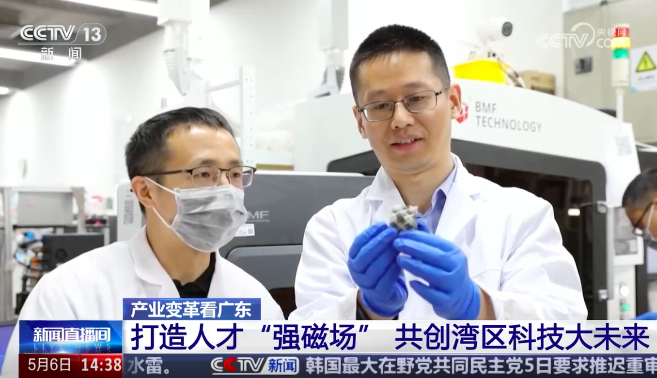 2025年5月6日,CCTV-13新闻频道《新闻直播间》,“产业变革看广东 打造人才“强磁场” 共创湾区科技大未来”,报道了大湾区的南方科技大学多功能增材制造与4D打印实验室葛锜 教授团队。在实验室中,葛锜教授正带领团队对离心式DLP多材料3D打印技术进行攻关,实现多材料间近乎零污染的切换,未来可以广泛应用于通讯、医学等领域。