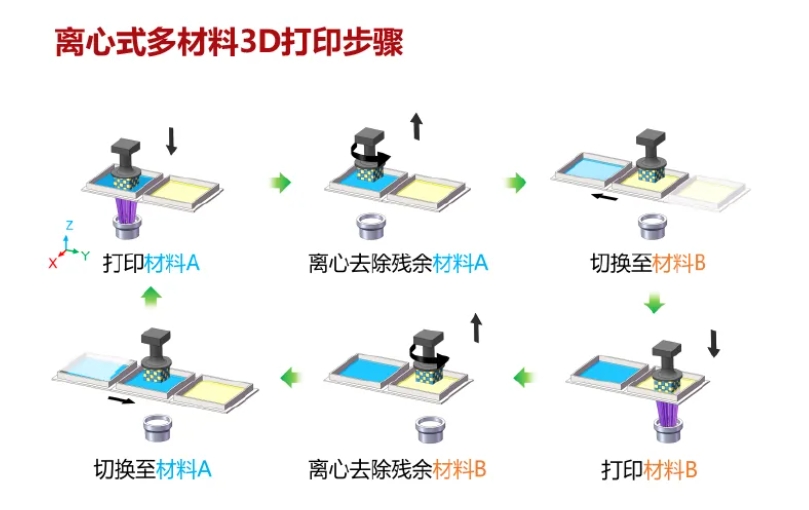 离心式DLP多材料3D打印技术通过“高速离心材料切换”与“多树脂槽动态调平”两大核心创新,突破传统光固化3D打印的材料兼容性瓶颈,实现了多材料功能耦合结构的一体化成型,为医疗、工业设计、航空航天等领域提供了颠覆性的制造解决方案。