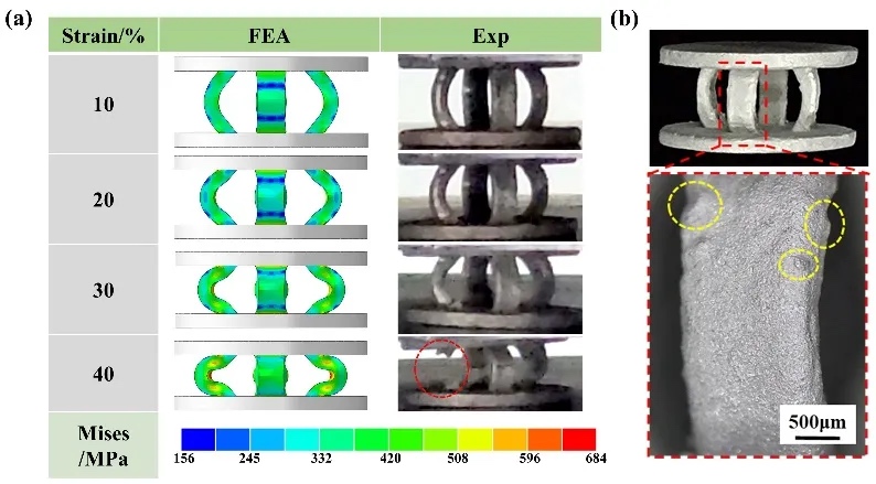 Fig. 4. Compression process of the quasi-circular ring structures under different strains and printed photos of the structural sample: (a) The compression process of the quasi-circular ring structures under different strains; (b) Printed photos of structural sample (yellow circle marking printing residues).