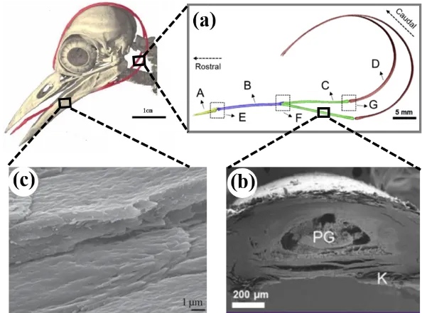 Fig. 1. Impact resistance principle of the woodpecker's head: (a) Schematic diagram of the hyoid bone; (b) Microstructure of the hyoid bone (K represents the keratin sheath and PG represents the central bone); (c) Microstructure of the beak.