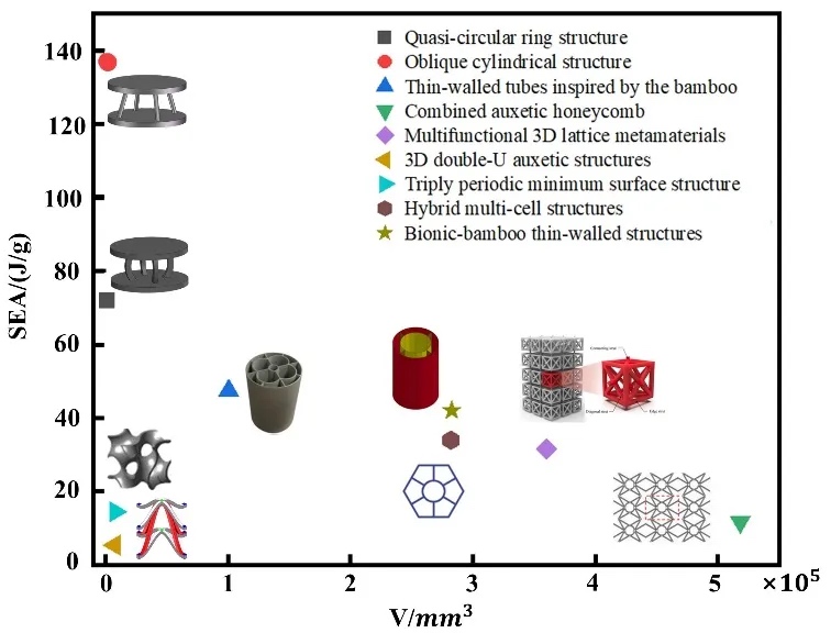 Fig. 6. Comparison of required volume and SEA between biomimetic double-layer impact-resistant structure and existing energy absorbing structure.
