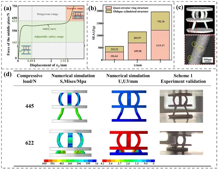 Fig.7. Engineering application: (a) Requirement analysis schematic diagram (the green and red shadows mark the range of force-displacement curves that meet the requirements for engineering applications (the green shadow marking the adjustable safety range, the red shadow marking the range where the structure needs must break), while the gray shadow marking the dangerous range that does not meeting the requirements of engineering applications); (b) The SEA of each structure in the double-layer impact-resistant structure (the pink shadow marking the SEA of the quasi-circular ring structure, the yellow shadow marking the SEA of the oblique cylindrical structure); (c) Printed photos of the double-layer impact-resistant structure (yellow circle marking printing residues); (d) Numerical simulation and experimental verification results of the scheme.