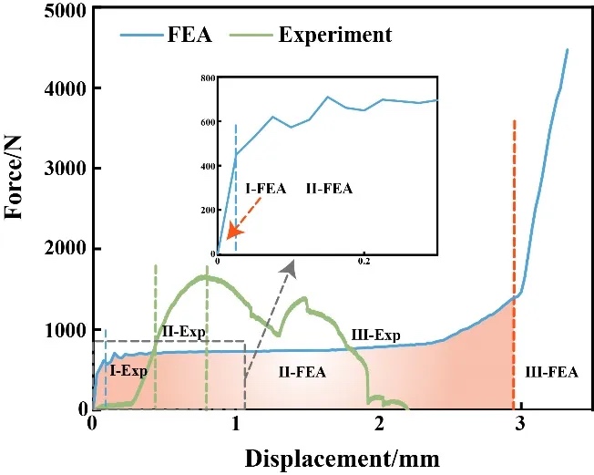 Fig. 3. Force-displacement curves of quasi-circular ring structure under FEA and experiment.