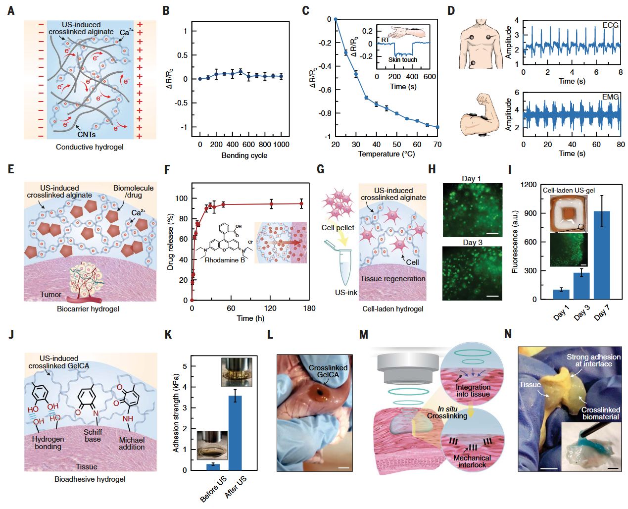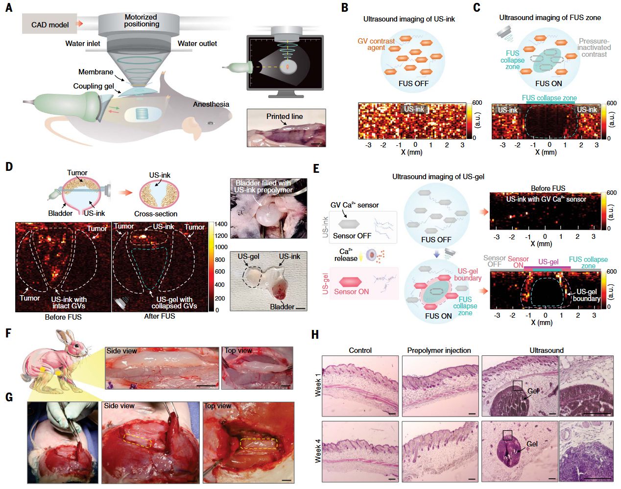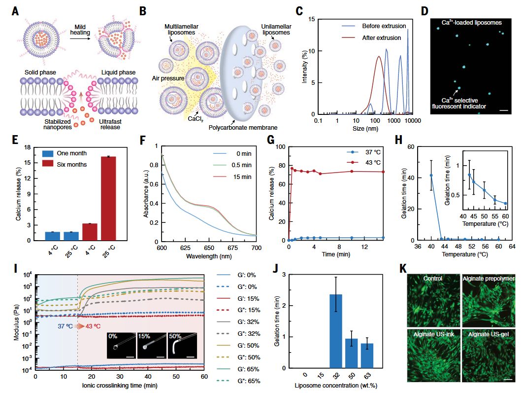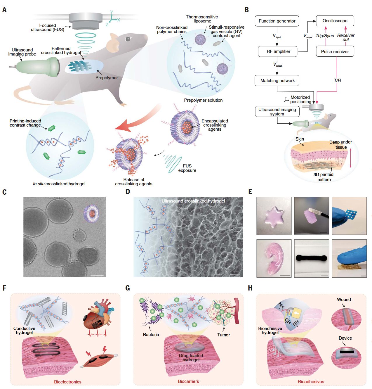 △图像引导的深部组织体内声音打印(DISP)。(A) DISP平台示意图。DISP系统使用由非交联预聚合物、装载交联剂的热敏脂质体和气囊组成的超声墨水(US-ink)。该超声墨水被注入体内,以非侵入性方式在体内精确制造功能性生物结构。基于气囊的集成超声成像用于监测目标器官,检测预聚合物的存在,并确保准确定位和成功形成超声凝胶(US-gel)。(B) 用于产生和监测聚焦超声(FUS)的体内打印设置。RF,射频;T/R,发射器/接收器。(C) 装载交联剂的热敏脂质体的透射电子显微镜图像。比例尺,100纳米。(D) 冷冻干燥的3D打印藻酸盐超声凝胶的扫描电子显微镜图像。比例尺,20微米。(E) 用声音在体内打印的功能性水凝胶结构。比例尺,5毫米。(F至H) 基于DISP的体内打印应用:用于感知和记录的生物电子设备(F),用于药物递送和组织再生的生物载体(G),以及用于创伤封闭和设备/组织界面的生物粘合剂(H)。