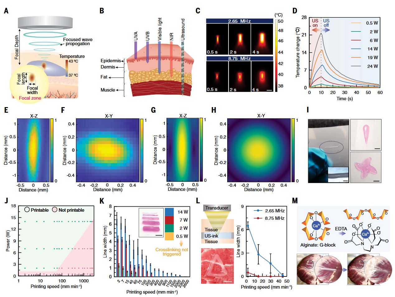 △聚焦超声引起的3D打印表征。(A) 聚焦超声波传播示意图,展示了对超声墨水的精确靶向。(B) 超声波与各种光源的组织穿透深度比较,突显了超声的优越穿透能力。UVA,紫外线A;UVB,紫外线B;NIR,近红外线。注意超声频率与穿透深度之间的反比关系。(C) 在不同频率和暴露时间下,焦点处温度分布的热力学模拟。比例尺,2毫米。(D) 在8.75MHz超声暴露10秒期间和之后焦点处的温度曲线。(E至H) 使用2.65MHz换能器的焦点处归一化压力图,X-Z平面上使用水听器的实验测量(E)和X-Y平面上的测量(F),以及X-Z平面上的模拟结果(G)和X-Y平面上的模拟结果(H)。(I) DISP打印的超声凝胶图案。比例尺,400微米。右侧图案比例尺,4毫米。(J) 在不同功率水平和打印速度下,使用8.75MHz换能器的藻酸盐超声墨水可打印性。(K) 使用8.75MHz换能器在不同功率水平和打印速度下,藻酸盐超声墨水的打印分辨率(以线宽表示)。比例尺,5毫米。(L) 在18W功率下,通过15毫米厚猪腰肉组织打印时,藻酸盐超声墨水的打印分辨率(以线宽表示),展示不同频率和打印速度的影响。(插图)在猪肉组织上的深部组织打印图案。比例尺,5毫米。(M) 通过5分钟0.025M EDTA溶液处理,实现DISP在组织上图案化的藻酸盐超声凝胶的解离。图中的误差棒表示平均值的标准偏差(n=3)。