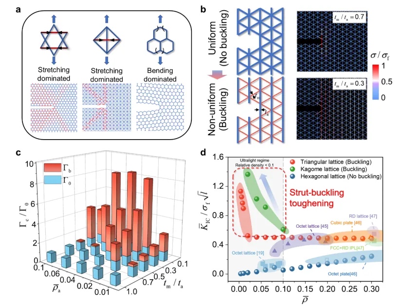研究团队基于裂尖杆件非线性屈曲调控能量耗散的增韧机制,系统建立了归一化韧性-相对密度预测模型,提出可通过杆件长径比、材料模量等参数优化屈曲响应。此外,研究团队提出了一种非均匀结构设计的新型增韧策略。基于此原理设计的非均匀点阵结构(图2b)成功诱导杆件屈曲,从而影响裂尖应力场,使超轻材料的断裂能得到大幅提升(图2c)。这些发现证实,通过精准调控裂尖杆件的非线性变形行为及其能量耗散路径,可在超低密度下实现高断裂韧性,为复杂结构点阵超材料的强韧力学设计提供了新范式(图2d)。