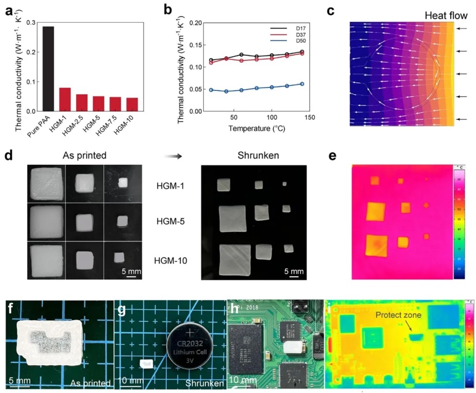图5a展示了纯PAA和HGM-1到HGM-10复合材料的热导率测试结果,随着HGMs含量的增加,复合材料的热导率显著降低,其中HGM-10复合材料的热导率仅为0.045 W m⁻¹ K⁻¹,相比纯PAA降低了72%~84%,这表明HGMs的引入有效提高了复合材料的热绝缘性能。图5b为不同粒径HGMs制备的HGM-10复合材料的热导率随温度变化曲线,结果显示,D17和D37 HGMs的热导率较为接近,而D50 HGMs的热导率相对较低,因此D50 HGMs被选用作为3D打印热保护复合材料的填料。图5c通过有限元方法(FEM)模拟了热流在HGMs/PAA复合材料中的传导过程,揭示了热流倾向于沿着HGMs的壁绕过微球,从而延长和偏转了热流路径,增加了复合材料的热阻,进而增强了热绝缘性能。图5d和图5e分别展示了不同面积的HGM-1、HGM-5和HGM-10复合材料的打印和干燥后对比照片以及相同厚度(5 mm)的干燥HGM-10复合材料的红外成像照片,从图中可以看出,HGM-1复合材料具有最高的收缩率,这对于制造小尺寸的3D热绝缘装置至关重要。图5f和图5g展示了HGM-1复合材料热屏蔽材料的打印和干燥后对比照片,图5h为HGM-1热屏蔽材料在微电路板上的安装照片,图5i为微电路在高负荷运行2小时后的红外热成像照片,通过对比可以看出,HGMs/PAA热保护复合材料能够有效降低保护区域的温度,与周围环境形成温度差,从而为微电子电路中的热敏感部件提供了良好的热保护。