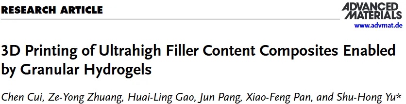 Chen Cui, Ze-Yong Zhuang, Huai-Ling Gao, Jun Pang, Xiao-Feng Pan, and Shu-Hong Yu* 等报道了一种通过将高膨胀率和干燥收缩的粒状水凝胶融入硬填料颗粒流,来克服 3D 打印复合材料中最大填料含量限制的新策略。以空心玻璃微球(HGMs)和粒状聚丙烯酸(PAA)水凝胶构建相图,实现了 HGM 质量分数高达 99.2 wt.% 的复合材料打印。该复合材料展现出类似陶瓷泡沫的脆性断裂行为、高透波性(0.996)和低导热率(0.045 W m⁻¹ K⁻¹ )。通过在微电路板上制作高 HGM 含量的热屏蔽,验证了其局部热保护性能,为 3D 打印超高填料含量复合材料创造更复杂结构和实现先进功能开辟了新途径 。🎉🎉🎉相关成果“3D Printing of Ultrahigh Filler Content Composites Enabled by Granular Hydrogels”发表于《Adv. Mater.》!🎉🎉🎉崔晨为第一作者。