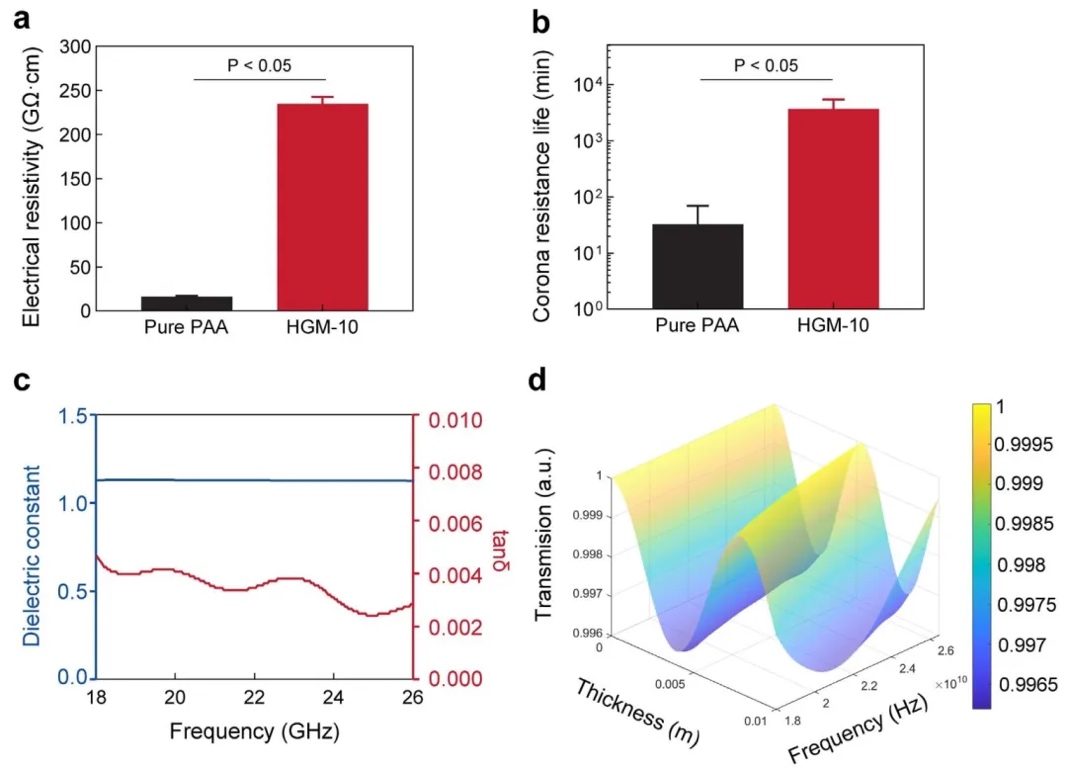 图4a展示了纯干燥PAA和HGM-10复合材料的电体积电阻率,结果表明,引入高含量HGMs后,复合材料的电体积电阻率显著提高,是纯PAA的14倍,这表明HGMs的加入显著增强了复合材料的电绝缘性能。图4b为电晕寿命测试结果,HGM-10复合材料在脉冲电晕条件下的工作寿命显著延长,说明其具有更好的电晕耐受性,这对于电子设备的热管理材料来说是一个重要的性能指标。图4c呈现了HGM-10复合材料的介电常数实部和介电损耗正切值,其在K波段(18-26 GHz)的介电常数实部为1.12-1.13,介电损耗正切值为0.0024-0.0047,低介电常数和介电损耗使得该复合材料在射频(RF)电路中具有良好的波透性,能够实现低损耗的RF信号传输。图4d为HGM-10复合材料的三维波透性示意图,通过计算得到的最大波透率|T²|为0.996,接近于1,这意味着电磁波在通过该复合材料时几乎可以完全透过而无损耗,这主要归因于复合材料的低介电常数和超高HGM含量,使得电磁波在HGMs与PAA界面之间的反射和吸收极小。