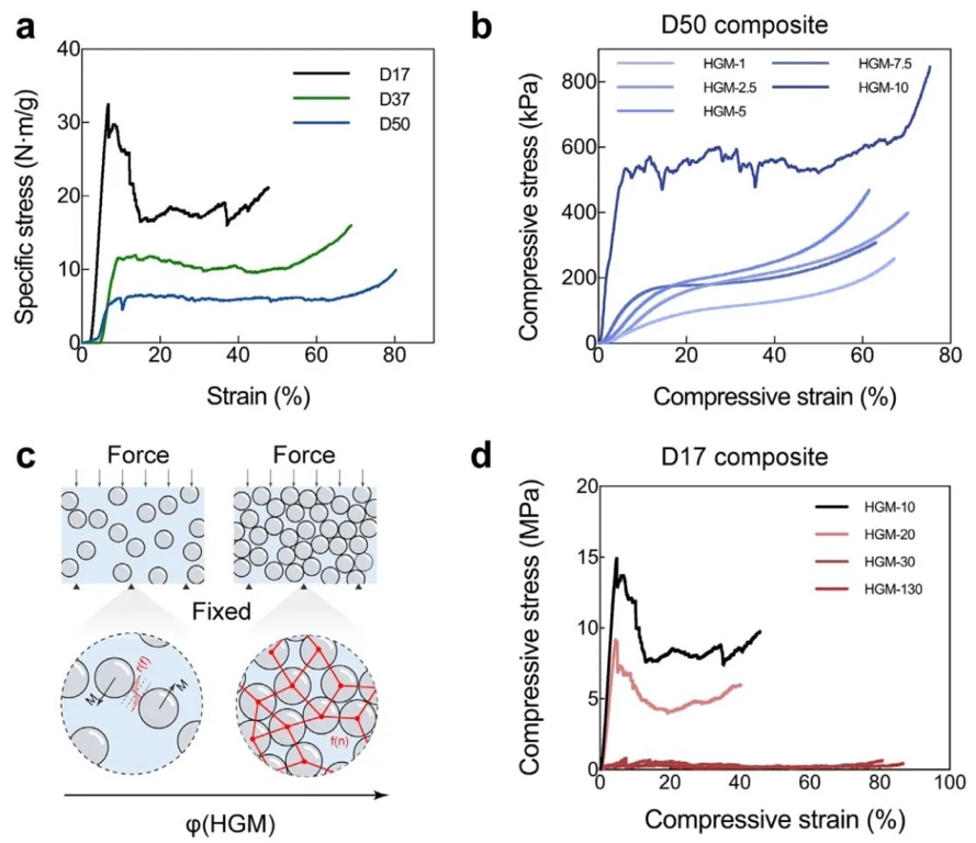 图3a展示了由三种不同粒径HGMs制备的HGM-10复合材料的代表性比应力-应变曲线,表明较小粒径的HGMs(D17)具有更高的比强度和更明显的屈服行为,而较大粒径的HGMs(D37和D50)则表现出较低的比强度和更早的屈服点,这与HGMs的粒径对其在复合材料中的堆积密度和应力传递效率有关。图3b为HGMs/PAA复合材料的代表性压缩应力-应变曲线,随着HGMs含量的增加,复合材料的应力平台逐渐升高,当HGMs与PAA的质量比达到10时,复合材料展现出类似陶瓷泡沫的脆性断裂行为,这表明高含量的HGMs改变了复合材料的应力传递机制,使其从以PAA聚合物的界面滑动为主转变为以HGMs之间的力链网络为主。图3c是高HGM含量复合材料压缩力学行为的示意图,进一步阐释了应力传递机制的变化。图3d展示了由D17 HGMs和0.5 wt.% PAA水凝胶制备的HGM-10、HGM-20、HGM-30和HGM-130复合材料的代表性应力-应变曲线,可以看出,当HGMs含量超过HGM-10时,复合材料的力学性能开始下降,这可能是由于过高的填充分数导致聚合物基体不足,无法有效粘结HGMs颗粒,从而使复合材料的结构变得松散。