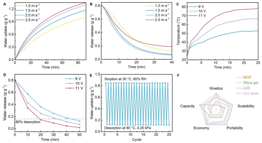 4. 3D打印CASN-Li整体材料的水分释放性能及综合性能评价,利用COMSOL软件模拟结合实验测试,研究不同空气流速、加热电压下材料的水分释放过程,并进行循环稳定性测试和材料特性对比。结果表明,在空气流速2.0 m/s、加热电压11 V时,材料能快速释放水分,25次循环测试中无泄漏和结构损坏,且在经济、可扩展性等方面具有优势。