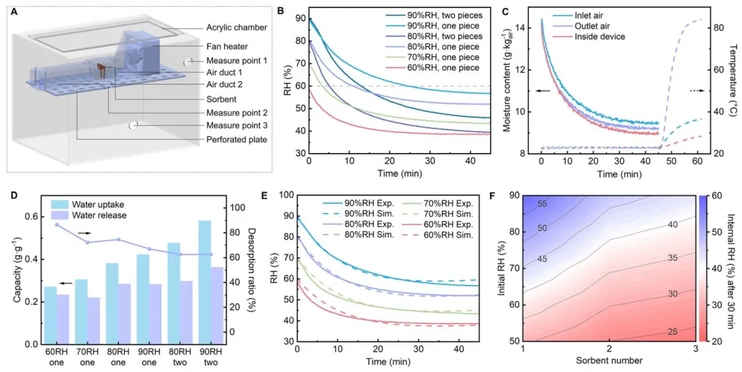 5. 3D打印CASN-Li整体材料快速湿度调节的演示,搭建透明丙烯酸装置进行实验,并通过COMSOL软件模拟,研究CASN-Li整体材料在实际装置中的除湿和再生效果。结果显示,一块CASN-Li能快速降低装置内相对湿度,增加吸附剂数量可加快除湿速度,除湿和再生过程能耗低,模拟与实验结果一致性良好。