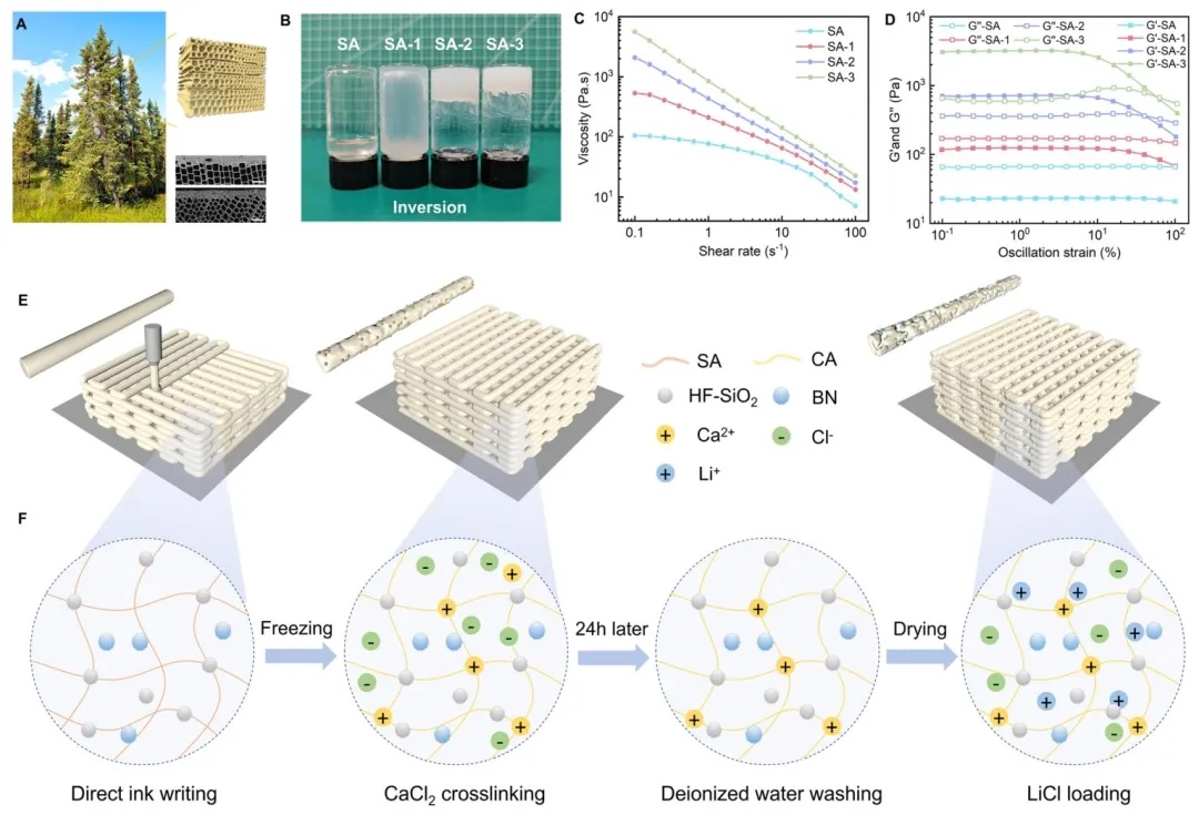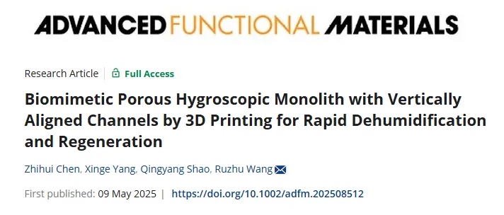 在此背景下,上海交通大学王如竹教授团队开展合作研究。他们受到树木分层多孔微结构的启发,利用直接墨水书写3D打印技术,成功制备出具有垂直定向通道和坚固结构的仿生吸附剂整体材料。该材料具有丰富的孔隙结构,涵盖毫米到微米尺度,能够实现快速吸水和便捷再生。相关工作以“Biomimetic Porous Hygroscopic Monolith with Vertically Aligned Channels by 3D Printing for Rapid Dehumidification and Regeneration”为题发表在《Advanced Functional Materials》上,为解决现有除湿技术的痛点、实现高效湿度调控提供了新的方向和解决方案。 上海交通大学制冷与低温工程研究所博士研究生陈芷荟为论文第一作者,王如竹教授为通讯作者。