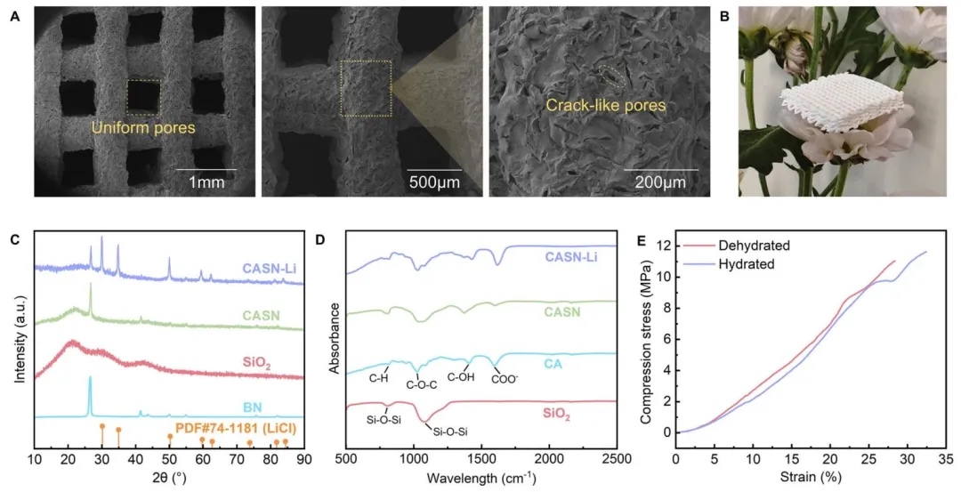 2. CASN-Li整体材料的表征,运用SEM、X射线衍射仪(XRD)、傅里叶变换红外光谱仪(FTIR)和动态力学分析仪(DMA)等手段,研究了CASN-Li整体材料的微观形貌、物相组成、官能团以及压缩性能。结果显示,材料表面粗糙且有裂纹状微孔,存在BN等成分,含有丰富的含氧官能团,具有良好的亲水性,在脱水和水合状态下都能承受较高的压缩应力,结构稳定。
