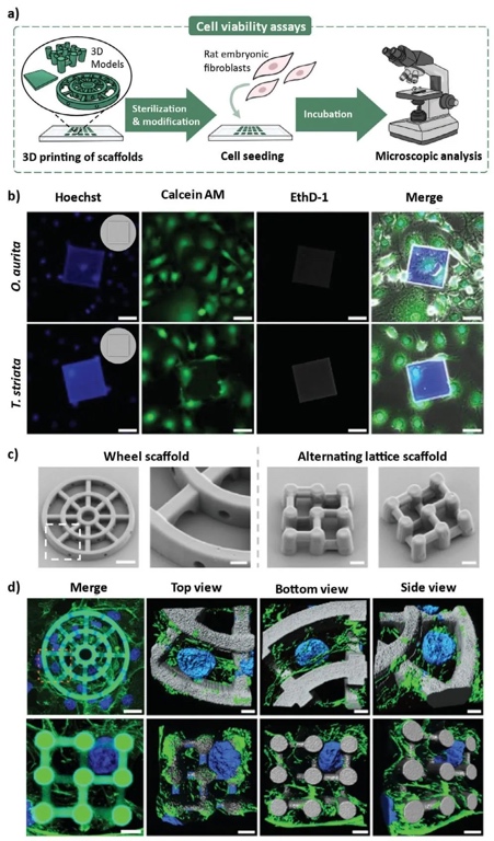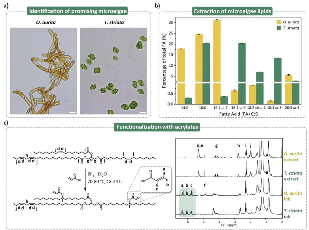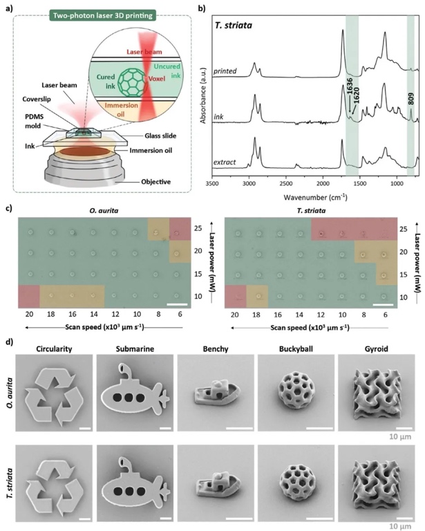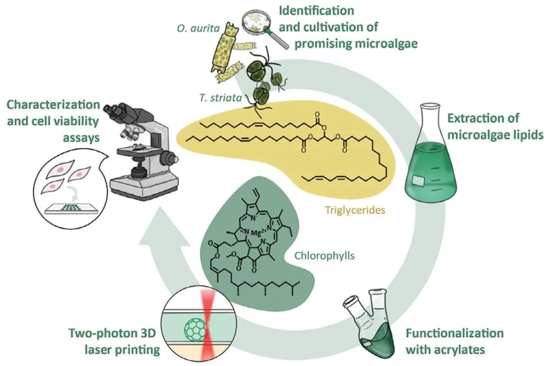 在此背景下,来自海德堡大学的Eva Blasco教授团队展开研究。他们利用微藻作为“生物工厂”,制备出适用于双光子3D激光打印的材料。团队筛选出Odontella aurita和Tetraselmis striata两种富含脂质的微藻,对其提取物进行功能化处理,得到可直接用于打印的墨水。该墨水以微藻中的叶绿素衍生物作为光引发体系,避免了使用非生物基和有毒的光引发剂。通过实验,团队研究了墨水的打印窗口、固化、分辨率等性能,并验证了3D打印结构的生物相容性。
