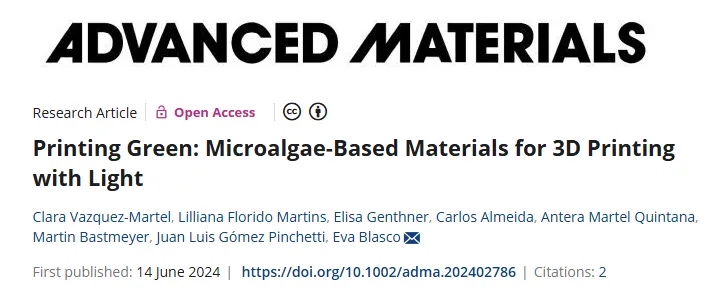 相关工作以“Printing Green: Microalgae-Based Materials for 3D Printing with Light”为题发表在《Advanced Materials》上,为可持续、生物基且生物相容性好的材料开发提供了新方向,有望推动光固化3D打印在生命科学领域的应用。