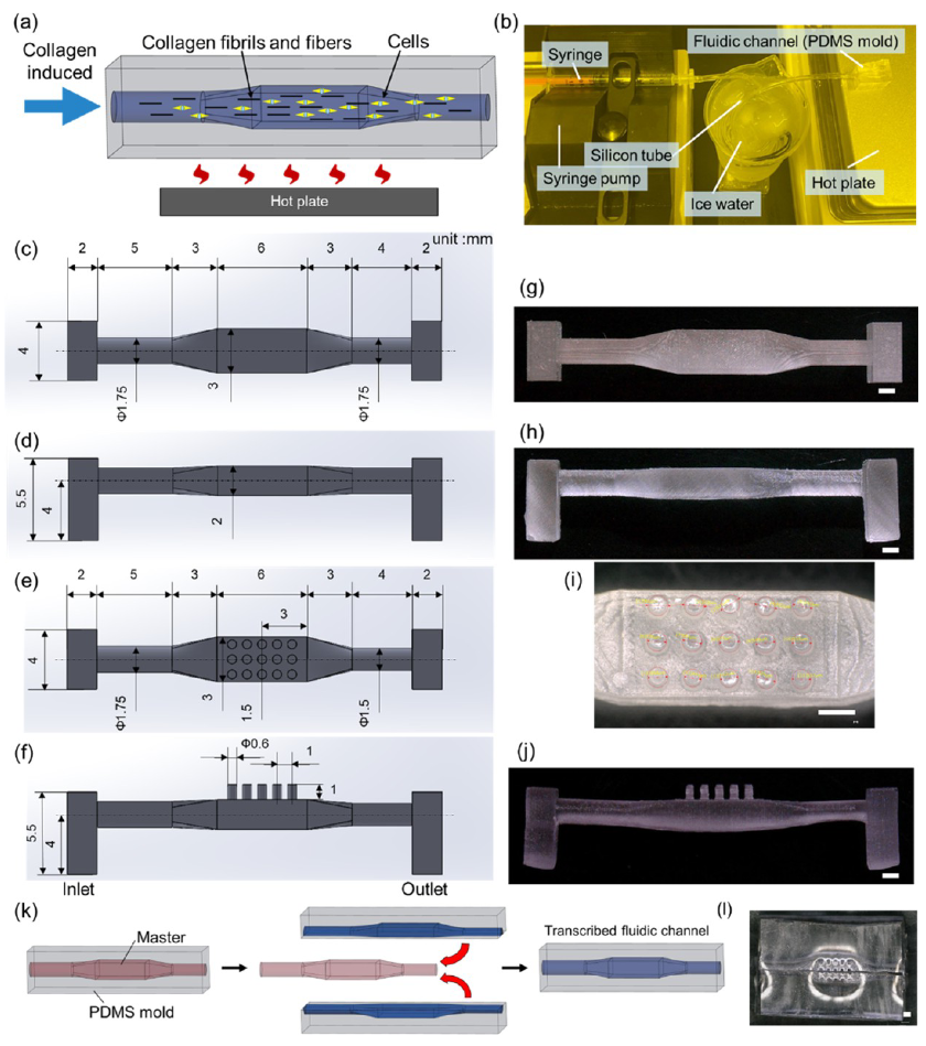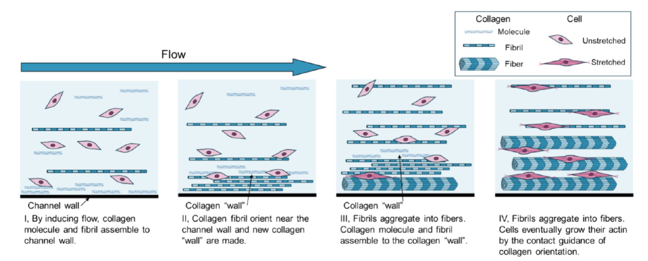 △定向胶原模型创建的示意图。实验流程概述,展示了由流动诱导的胶原原纤维、纤维和细胞定向排列