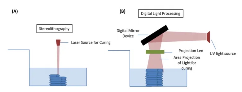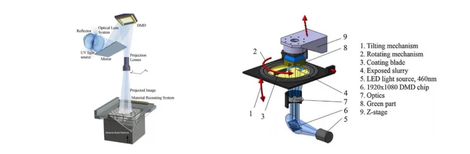 光固化陶瓷技术方面目前主要有逐点扫描式光固化和面曝光固化两种[6],相应的打印设备分别是以紫外激光器为光源的点-线扫描式的光固化陶瓷3D打印机(以下简称此方式为SLA)和以数字光源(Digital Light Procession)进行面曝光的光固化陶瓷3D打印机(以下简称此方式为DLP),两者的示意图如下[7]: