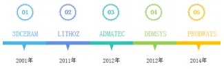 而光固化陶瓷3D打印机真正推向市场,为市场认识并且逐步认可主要发生在2010年之后,这其中具有代表性的陶瓷光固化打印机厂家国外主要有3D CERAM(尽管3DCERAM公司2001年成立,然而他们直到2015年才推出首款工业级陶瓷3D打印机[5])、LITHOZ、ADMATEC、Prodways等,这些企业成立的时间轴如下图所示。