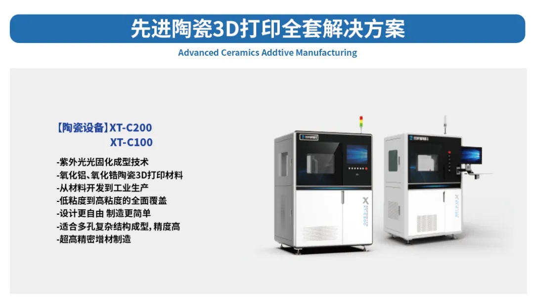 深圳协同创新高科技发展有限公司(以下简称 “ 协同高科 ” )光固化陶瓷团队是国内较早开始进行工业级陶瓷光固化浆料配方、工艺应用开发的专业团队之一,从2016年开始至今已有该领域将近十年的技术累计,公司的优势在于将近十年的陶瓷光固化材料配方与工艺的研发,并且深耕于高纯度氧化铝、高精度高强度氧化锆等少数几种热门应用陶瓷材料的开发,应用于航空航天、半导体、精密电子等行业。公司在2023年面向市场推出了XT-C100、XT-C200机型,这些陶瓷打印机的推出是公司光固化陶瓷浆料及工艺技术累积下的装备定向开发。