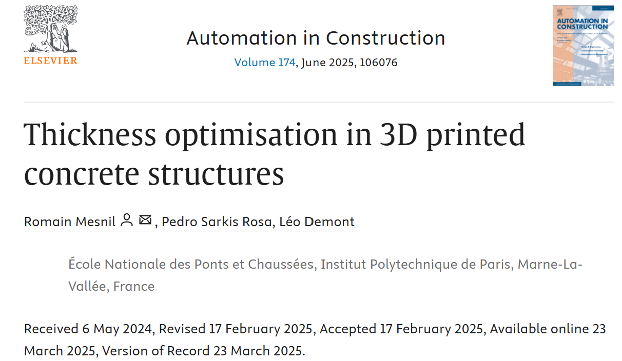 这项研究由巴黎高科桥的 Romain Mesnil 博士领导,并以题为“Thickness optimisation in 3D printed concrete structures”的论文发表在《建筑自动化》杂志上,表明通过机器人速度动态调整的可变层厚度可以显著减少混凝土壳体结构增材制造中的打印时间和环境影响。