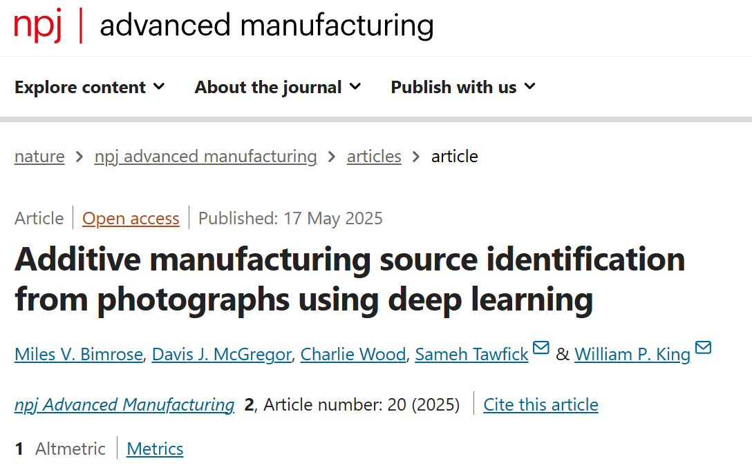 2025年5月,来自伊利诺伊大学厄巴纳-香槟分校的研究团队在npj Advanced Manufacturing上发表了一篇重要论文,题目为Additive manufacturing source identification from photographs using deep learning(利用深度学习从照片中识别增材制造来源),展示了如何利用深度学习模型通过零件照片预测AM零件的来源。这一研究可以监控AM供应商并验证AM零件和材料的质量,也为未来的智能制造质量控制系统奠定了基础。