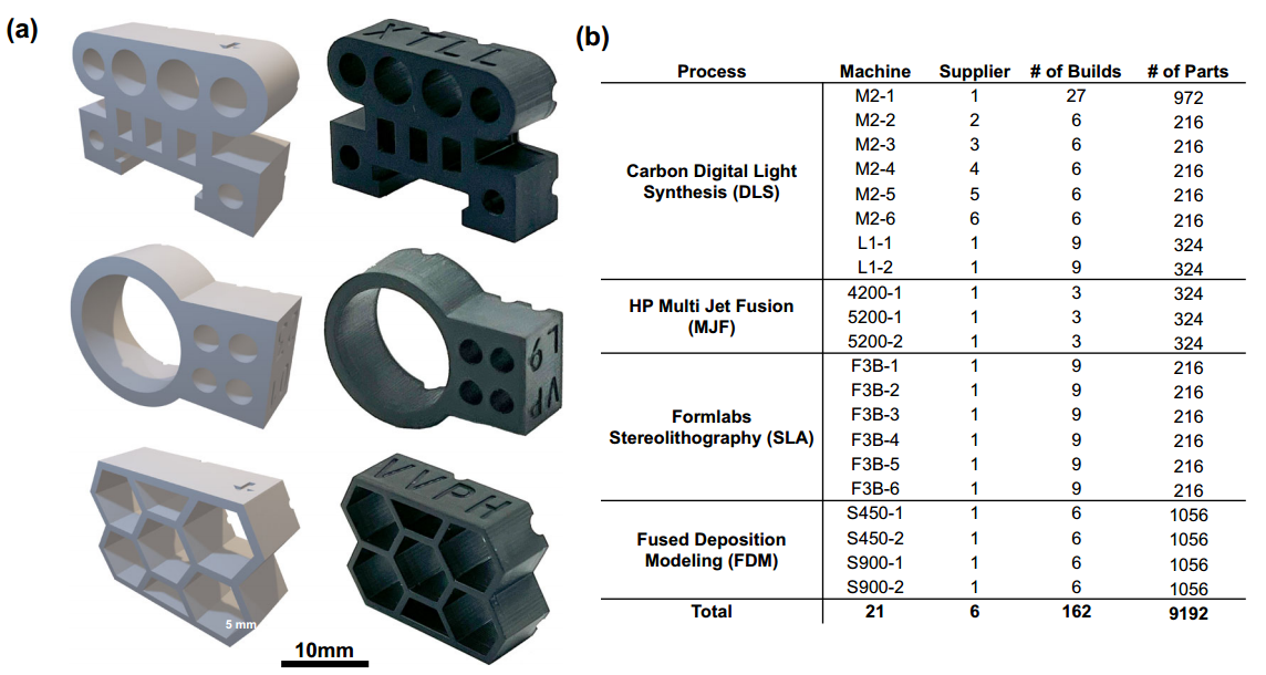 该研究的核心在于开发一种能够从零件照片中识别其制造来源的深度学习模型。研究人员使用了21台不同的打印机,生产了9192个零件,涵盖了三种独特的设计和四种AM工艺:数字光合成(Digital Light Synthesis, DLS)、多喷嘴熔融(Multi Jet Fusion, MJF)、立体光刻(Stereolithography, SLA)和熔融沉积建模(Fused Deposition Modeling, FDM)。每个零件都经过高分辨率扫描仪拍摄,生成高质量的照片作为训练数据。