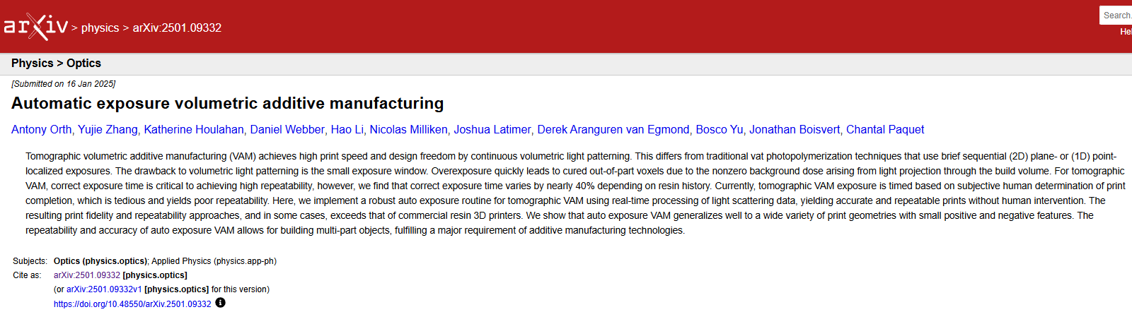 2025年5月20日,加拿大国家研究委员会和维多利亚大学的团队开发了一种用于断层扫描体积增材制造 (VAM) 的全自动曝光控制系统。VAM 是一种利用旋转树脂槽内投射的光图案一次性制造完整物体的技术,自动曝光系统显著提高了这项工艺的准确性和可重复性。研究结果以题为“Automatic exposure volumetricadditive manufacturing”的论文已发布在arXiv 上的一份未经同行评审的预印本上。这项技术能够实现免提打印,特征分辨率与商用 SLA 和 DLP 打印机相当或更高,同时打印部件的速度最高可提高十倍。