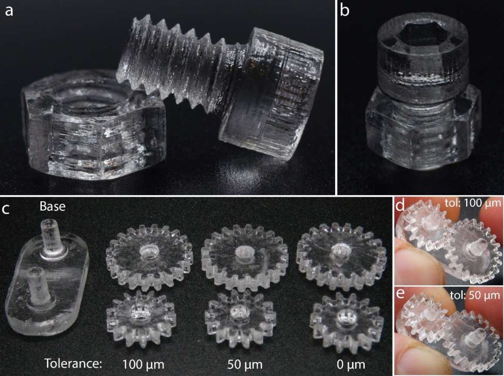 △AE-VAM打印的机械部件:一个功能齐全的 ¼-20 螺钉和螺母,以及一个公差为 50 μm 的齿轮组件。这些部件也可以与标准金属硬件配合使用。图片来自 Antony Orth 等人,加拿大国家研究委员会/维多利亚大学。