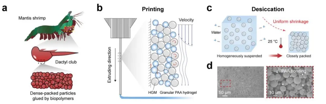 图1、超高填料含量复合材料的制备过程示意图 a) 自然界中螳螂虾螯足表面的生物矿化层示意图;b) 挤出打印过程中HGMs和PAA颗粒水凝胶的流动示意图;c) 打印的HGMs/PAA复合水凝胶在可控干燥后收缩,使内部HGM紧密堆积;d) 收缩后的HGMs/PAA复合材料扫描电镜照片。
