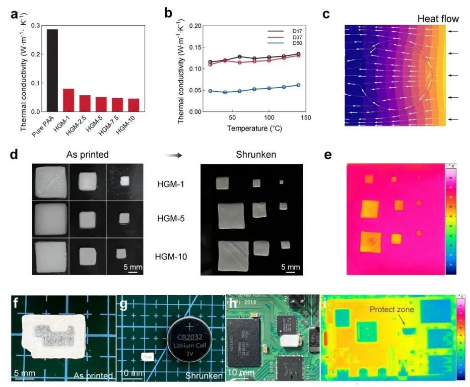 图5、超高HGM含量复合材料的热绝缘性能及应用 a) 纯PAA及HGM-1至HGM-10复合材料的室温热导率;b) 不同粒径HGM的复合材料在20 °C~140 °C的热导率;c) HGMs/PAA复合材料微观热流线有限元模拟;d) 不同HGM含量复合材料打印态和收缩态的光学照片;e) 相同厚度的干燥HGM-10复合材料在热板上的红外热成像图;f-g) 打印和干燥后的热防护罩光学照片;h) 热防护罩安装在微电路板上的照片;i) 安装热防护罩的微电路工作2小时后的红外热成像图。