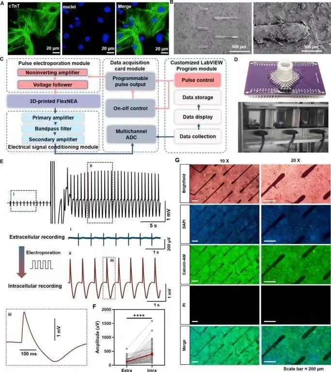 研究团队开发的FlexNEA器件通过高精度3D打印工艺实现电极结构定制化设计,结合纳米银材料的优异导电性和柔性基底的低机械应力特性,显著提升了细胞-电极界面耦合效率。实验表明,FlexNEA通过生物安全电穿孔技术可实现99%以上的细胞内访问成功率,其柔性特性使电极紧密贴合心肌细胞膜动态形变,获得较传统平面电极提升近3倍的动作电位幅值(图1)。在连续5天的长期测试中,FlexNEA稳定记录到高信噪比(>20 dB)的胞内信号,且经高频短时电穿孔操作后仍保持优异性能。研究进一步验证了该器件在药物评估中的应用潜力,成功捕捉到离子通道阻断药物处理后动作电位持续时间(APD50)、去极化速率等参数的细微变化,为精准药效评估提供了新工具。