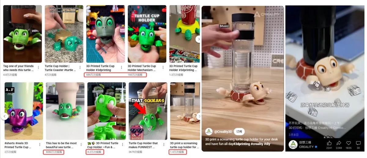 2.全平台推广:创想云平台通过全站推广、各大 3D 打印KOL、Creality官方全球社交媒体平台进行广泛的宣传。他们发布了一系列精美的3D打印视频和实拍图,展示了乌龟杯垫的设计亮点和使用场景,吸引了大量潜在客户的关注。
