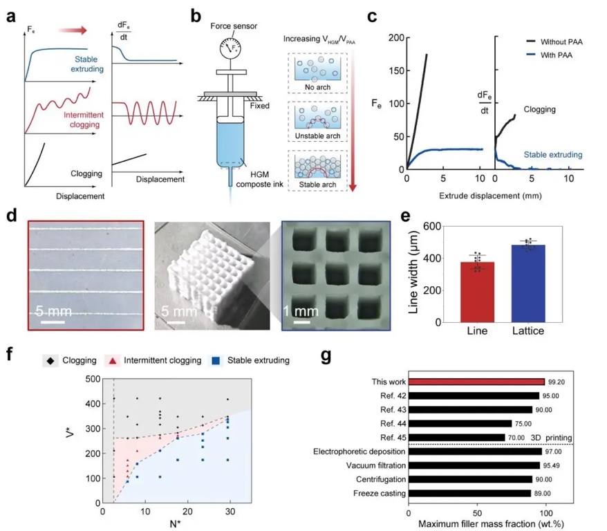 研究人员系统研究了复合墨水的打印性能和影响因素(图2)。通过引入PAA颗粒水凝胶,即使HGMs的质量分数高达99.2 wt.%(体积分数99.7 vol.%),墨水仍能实现稳定挤出。研究人员建立了填料与水凝胶体积比V*和颗粒与喷嘴直径比N*的打印状态相图(图2f),为实现无堵塞打印提供了定量指导。利用该策略,成功打印出最小线宽~377 μm的精细线条和~483 μm点阵结构(图2e),验证了该方法在高填料含量下的稳定打印能力。ysh图片2.jpg