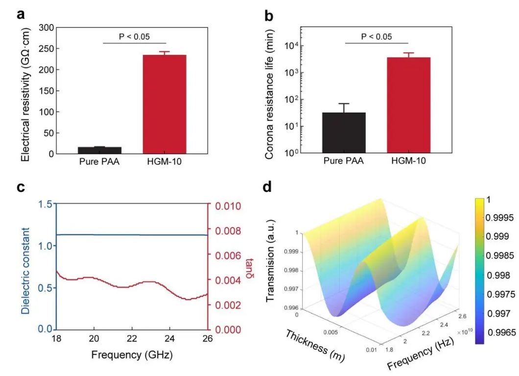 此外,所制备的HGM/PAA复合材料还表现出优异的电磁性能(图4)。与纯PAA材料相比,引入高含量HGM的HGM-10复合材料的体积电阻率提高了14倍,并且其耐电晕寿命也得到显著延长。在18~26 GHz(K波段)频率范围内,HGM-10复合材料的介电常数实部低至1.12~1.13,介电损耗正切为0.0024~0.0047,显示出优异的透波性能,其最大透波率可达0.996。ysh图片4.jpg