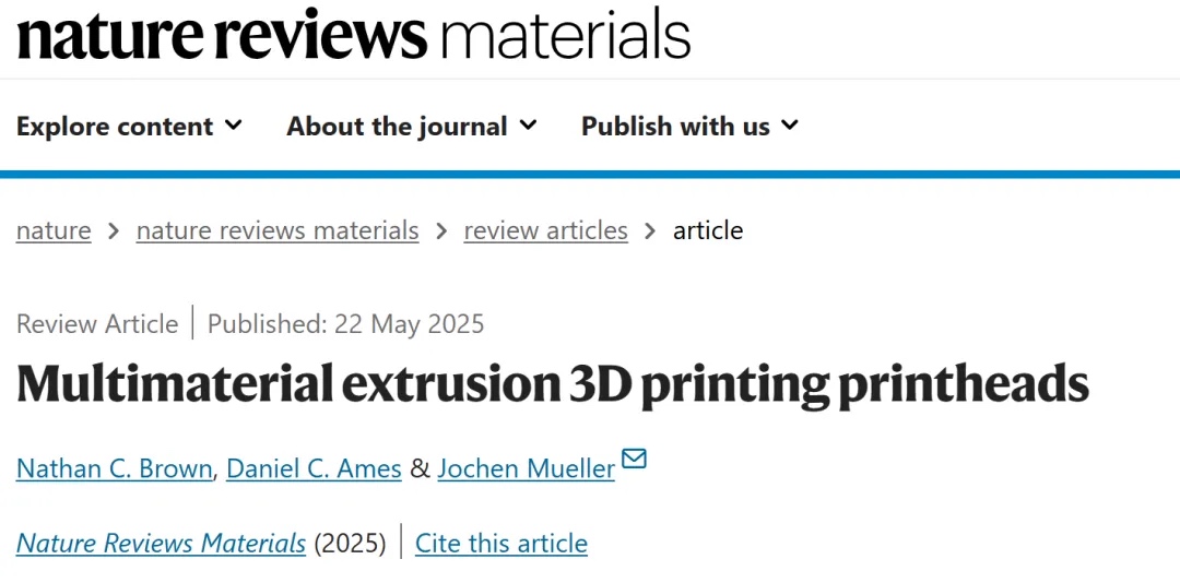 近日,约翰霍普金斯大学的Nathan C. Brown、Daniel C. Ames和Jochen Mueller合作,全面探讨了喷头技术在材料挤出3D打印系统中的核心作用及其最新进展。系统总结了喷头技术如何通过多功能设计突破传统制造限制,并为复杂材料组合和高精度结构提供了全新解决方案。相关论文以《多材料挤出3D打印喷头》为题,发表在《自然综述:材料》(Nature Reviews Materials)。
