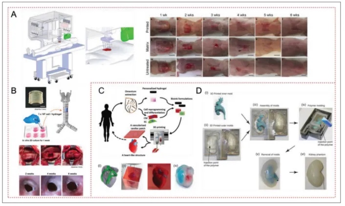 团队总结了皮肤、气管、尿道等管状器官及心脏等复杂器官的3D打印进展。例如,原位生物打印技术可直接在创面逐层沉积自体细胞-水凝胶复合物,加速全层皮肤缺损愈合;甲基丙烯酰化丝素蛋白(Sil-MA)支架成功修复兔气管缺损,新生软骨与上皮组织功能完整(图4)。