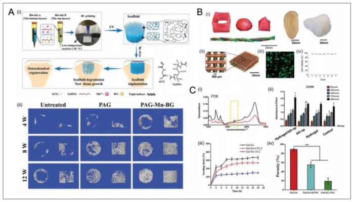 图3. (A) (i) 使用PACG-GelMA水凝胶-Mn²⁺作为顶层和PACG-GelMA水凝胶-BG作为底层的支架生物打印;(ii) 修复骨软骨缺损的示意图。(B) PEG-SA-纳米黏土水凝胶的3D生物打印。(i) 不同形状的3D生物打印:空心立方体、半球、金字塔、扭曲的耳朵形状和鼻子;(ii) 使用坚韧且生物相容的水凝胶网格;(iii) HEK细胞的活细胞和死细胞染色;(iv) 7天后HEK细胞的活性测试。(C) (i) 红外光谱:水凝胶(黑线)和附着于GO-np的水凝胶(红线);(ii) 水凝胶、GO-np、水凝胶/GO-np的活性测试,以及空白组中的软骨细胞;(iii) 打印的溶胀率;(iv) 含碳纳米管(CNTs)的Gel-SA水凝胶支架的孔隙率。