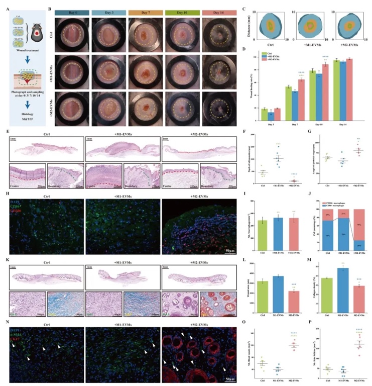 3. M2-EVMs对体外细胞行为的调控作用,通过划痕实验、管形成实验及RT-qPCR,研究了M2-EVMs对成纤维细胞、内皮细胞及巨噬细胞的功能影响。结果表明,M2-EVMs显著抑制成纤维细胞活化(α-SMA表达降低50%)和迁移,促进内皮细胞血管生成(管形成数量增加80%),并诱导巨噬细胞向M2表型极化(CD206+比例从10%升至45%),而M1-EVMs作用相反。