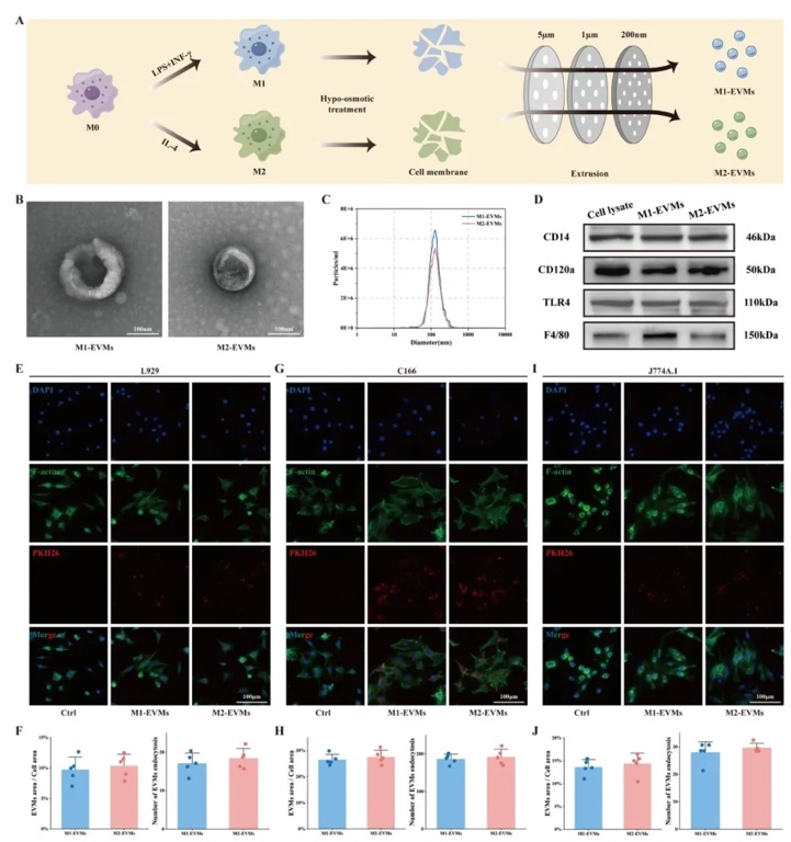 2. M2巨噬细胞源细胞外囊泡模拟物(M2-EVMs)的制备与表征,利用膜挤压技术结合超声破碎和梯度离心,制备了M1/M2-EVMs,并通过HR-TEM、NTA及蛋白质印迹分析其结构和成分。结果显示,M2-EVMs呈圆形囊泡结构(粒径约100 nm),高表达M2标记蛋白(如CD206、Arg1),低表达促炎蛋白(如TLR4),且能被成纤维细胞、内皮细胞和巨噬细胞有效摄取(6 h内摄取率>70%)。