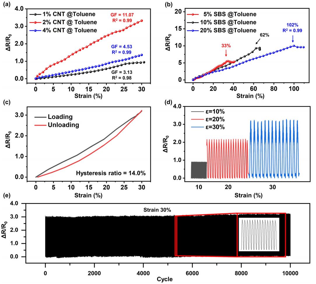 这种应变传感器具备卓越的性能指标:灵敏度系数高达11.07,线性度接近完美(R²≈0.99),最大应变范围可达102%。更重要的是,即使在30%应变下经过10,000次循环测试后,传感器仍能保持稳定的性能,展现出了出色的耐久性。