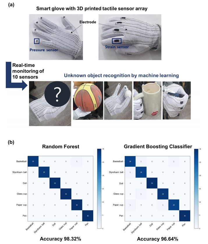 最令人惊叹的应用是智能手套的物体识别功能。研究团队在手套的关节处安装应变传感器,在指尖安装压力传感器,总共集成了10个传感器。通过机器学习算法的训练,这款智能手套能够识别不同的物体。在对篮球、泡沫球、玩偶、玻璃杯、纸杯和笔等六种物体各进行30次抓取训练后,手套的识别准确率达到了惊人的98.32%(使用随机森林算法)和96.64%(使用梯度提升分类器)。